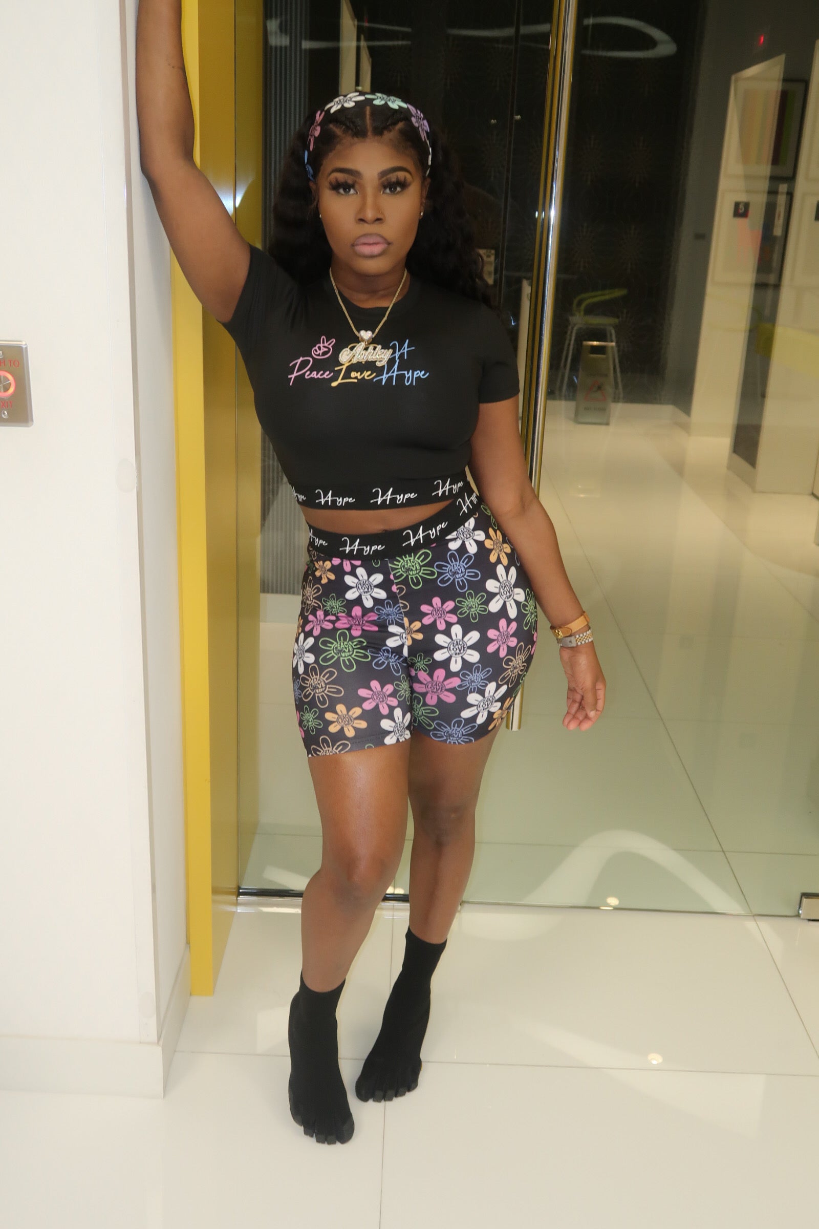 BLACK TWO PEICE SET COMES WITH HEADBAND.HAS GREAT STRETCH RECOMMEND ORDERING A SIZE DOWN